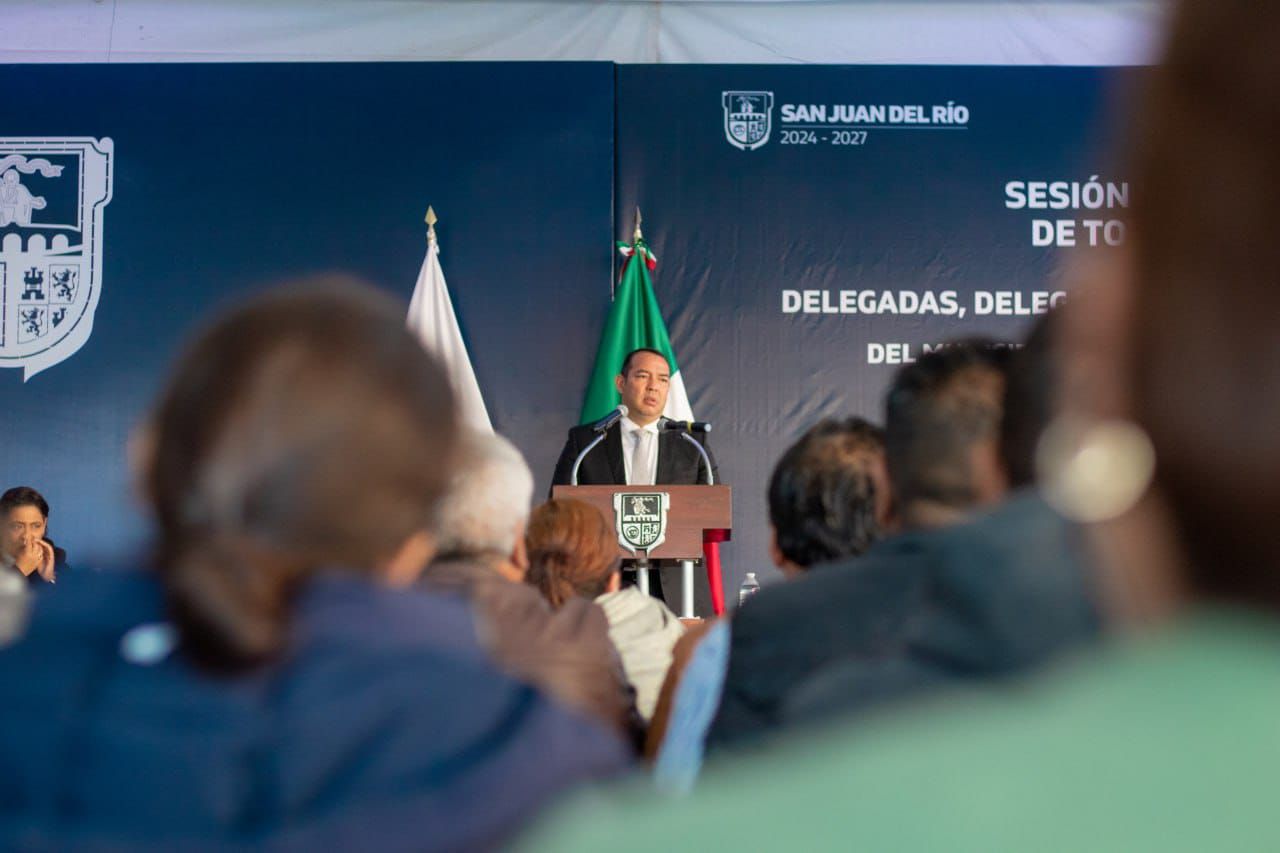 De la mano de ustedes, nuestras delegadas y subdelegadas, de nuestros delegados y subdelegados, nada ni nadie nos detiene, afirmó el presidente municipal de San Juan del Río, Roberto Cabrera Valencia, en sesión extraordinaria de Cabildo del Ayuntamiento Sanjuanense, en la que rindieron protesta los y las titulares designados para 15 Delegaciones y 66 Subdelegaciones de la Administración Municipal 2024-2027.