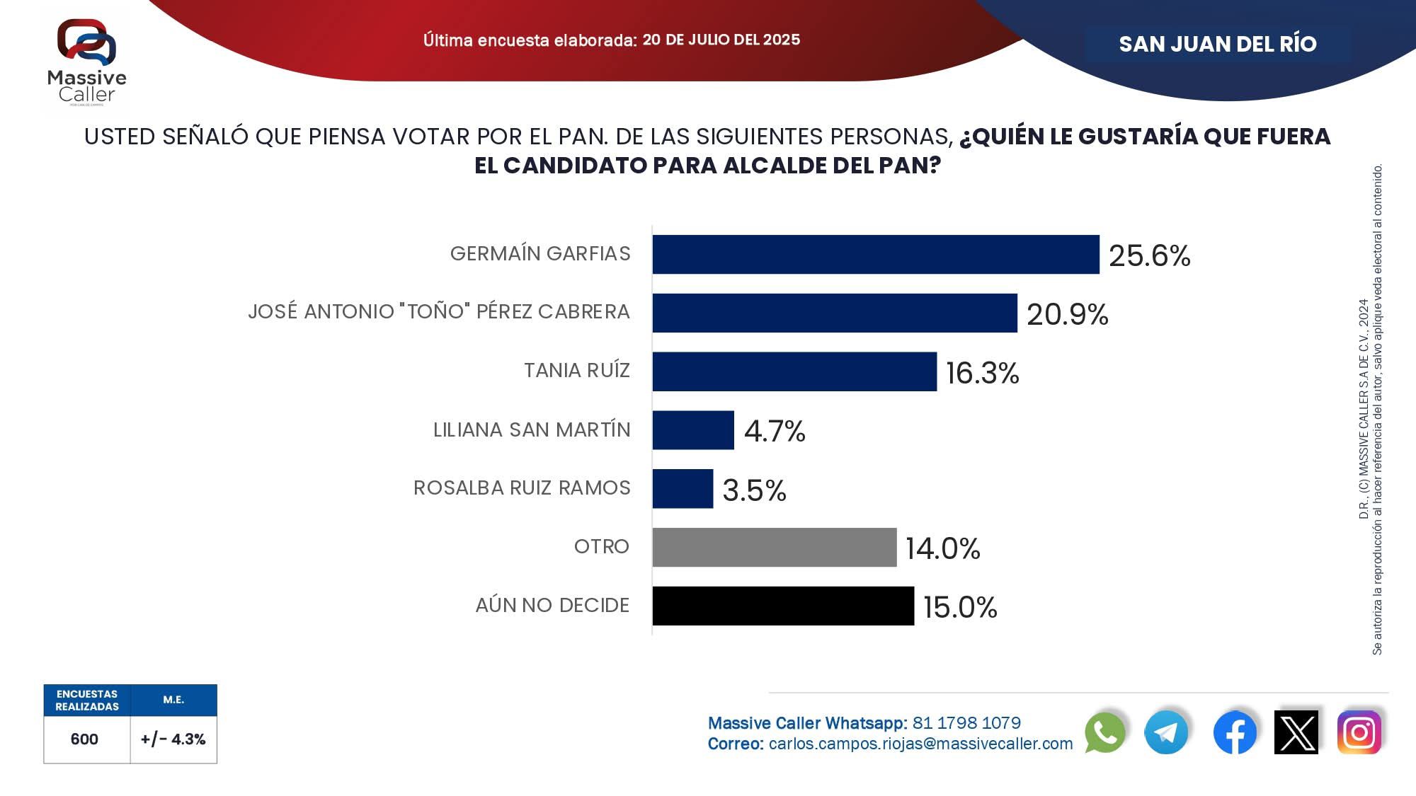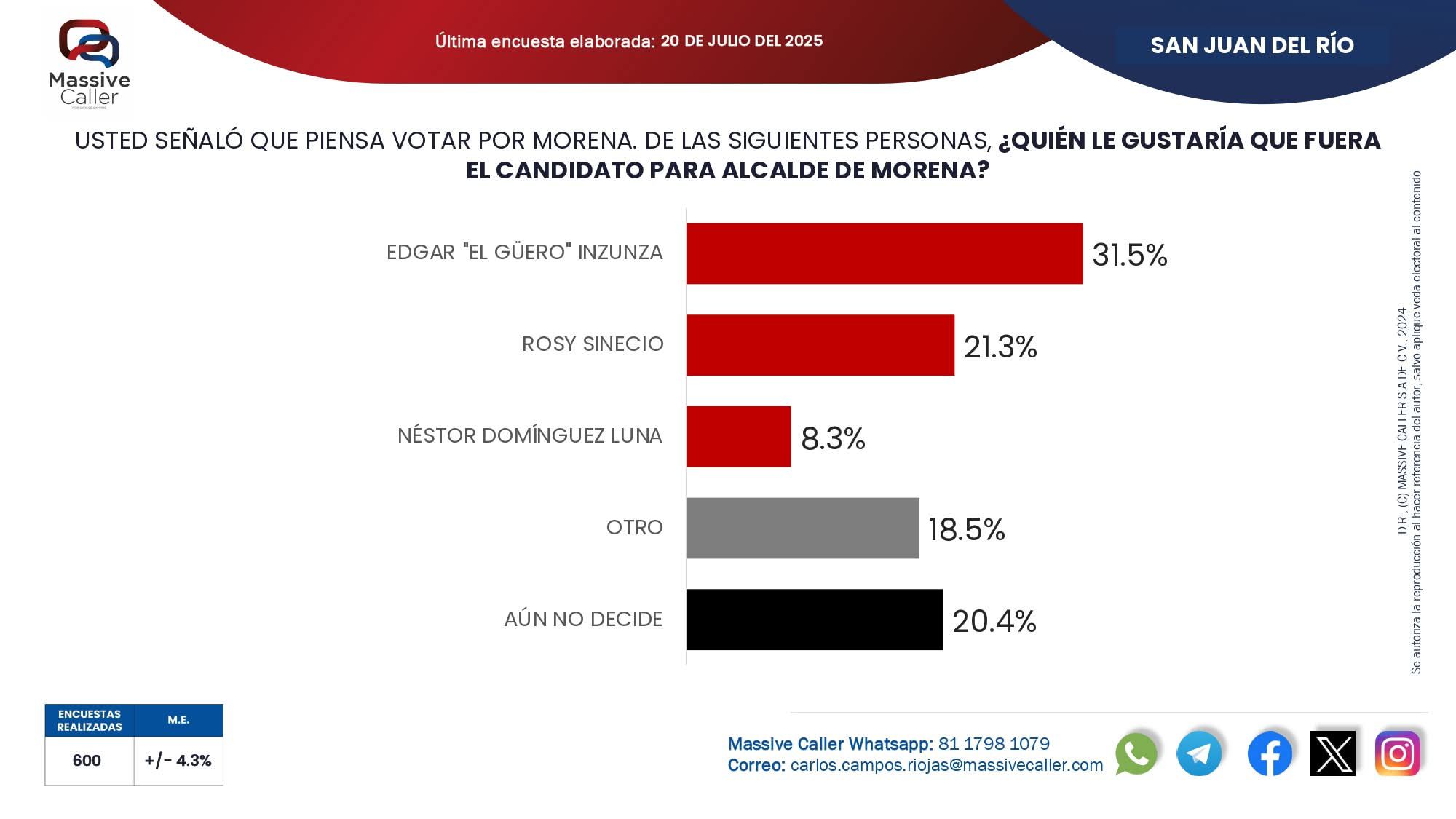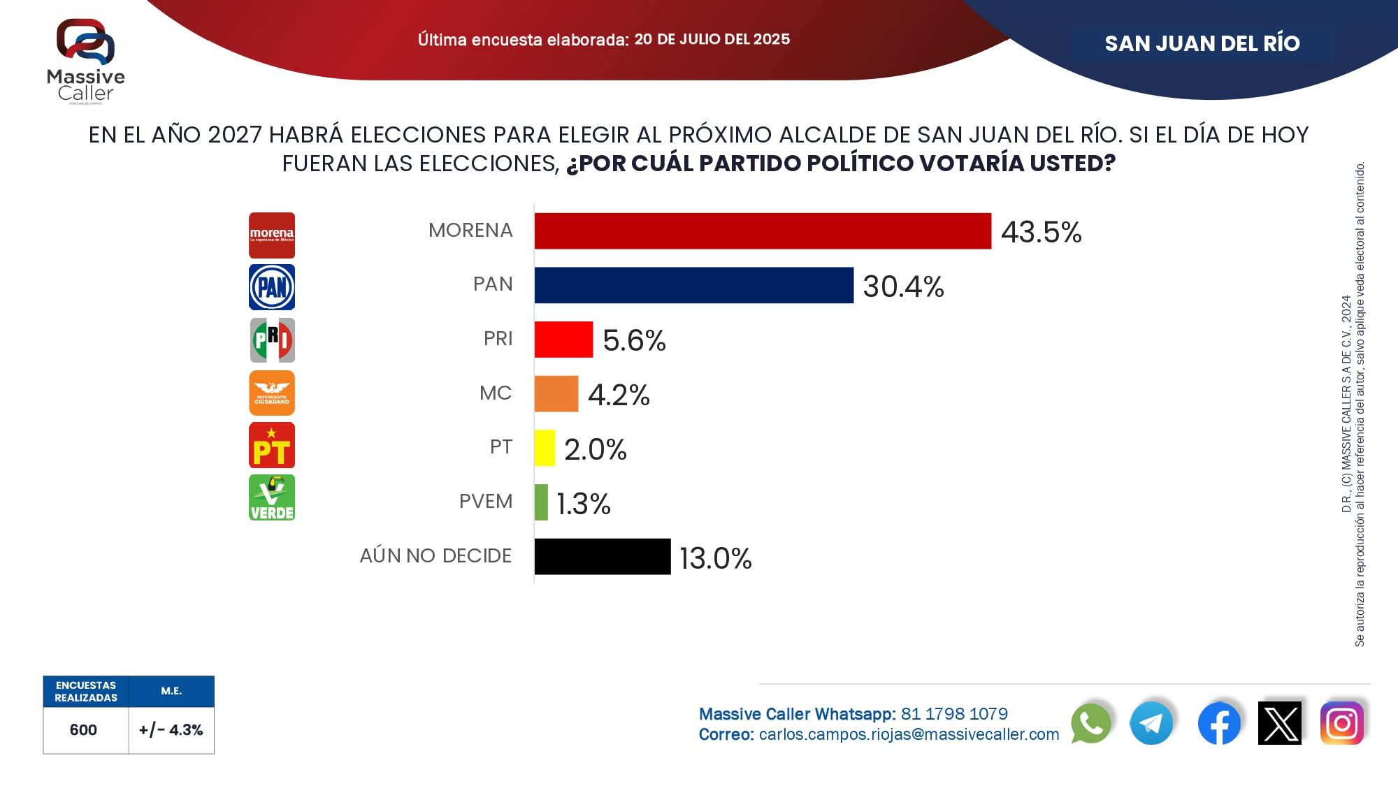 El Movimiento de Regeneración Nacional (MORENA) en el municipio de San Juan del Río tendría -en estos momentos- una amplia ventaja, en las preferencias electorales rumbo al 2027, de poco más de 13 puntos porcentuales, sobre el Partido Acción Nacional (PAN); según la casa encuestadora de Massive Caller.