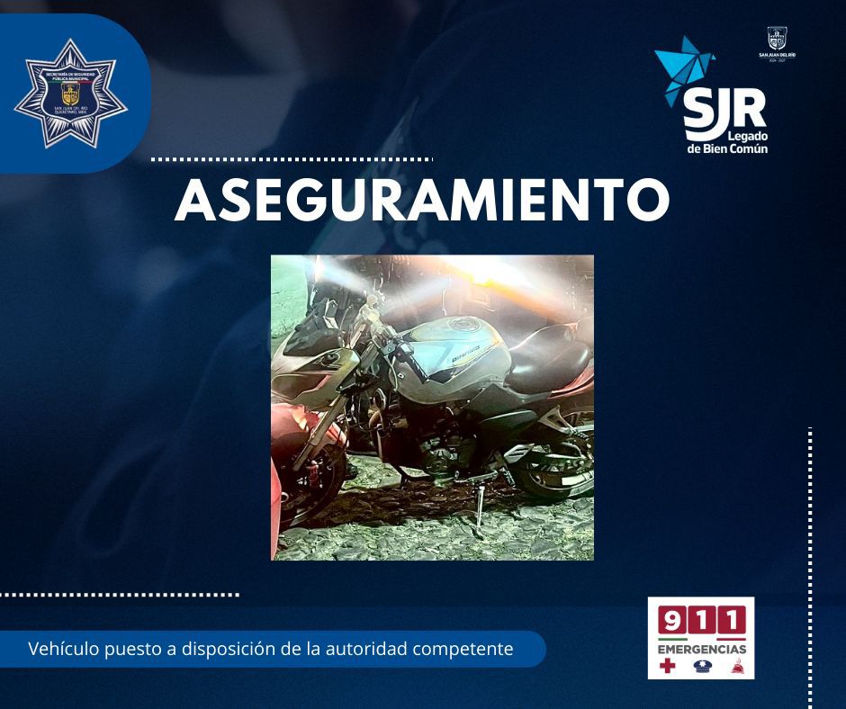 En labores de vigilancia y seguridad, elementos de la Secretaría de Seguridad Pública Municipal de San Juan del Río (SSPM-SJR) realizaron la detención de un masculino en posesión de una motocicleta con reporte de robo reciente.