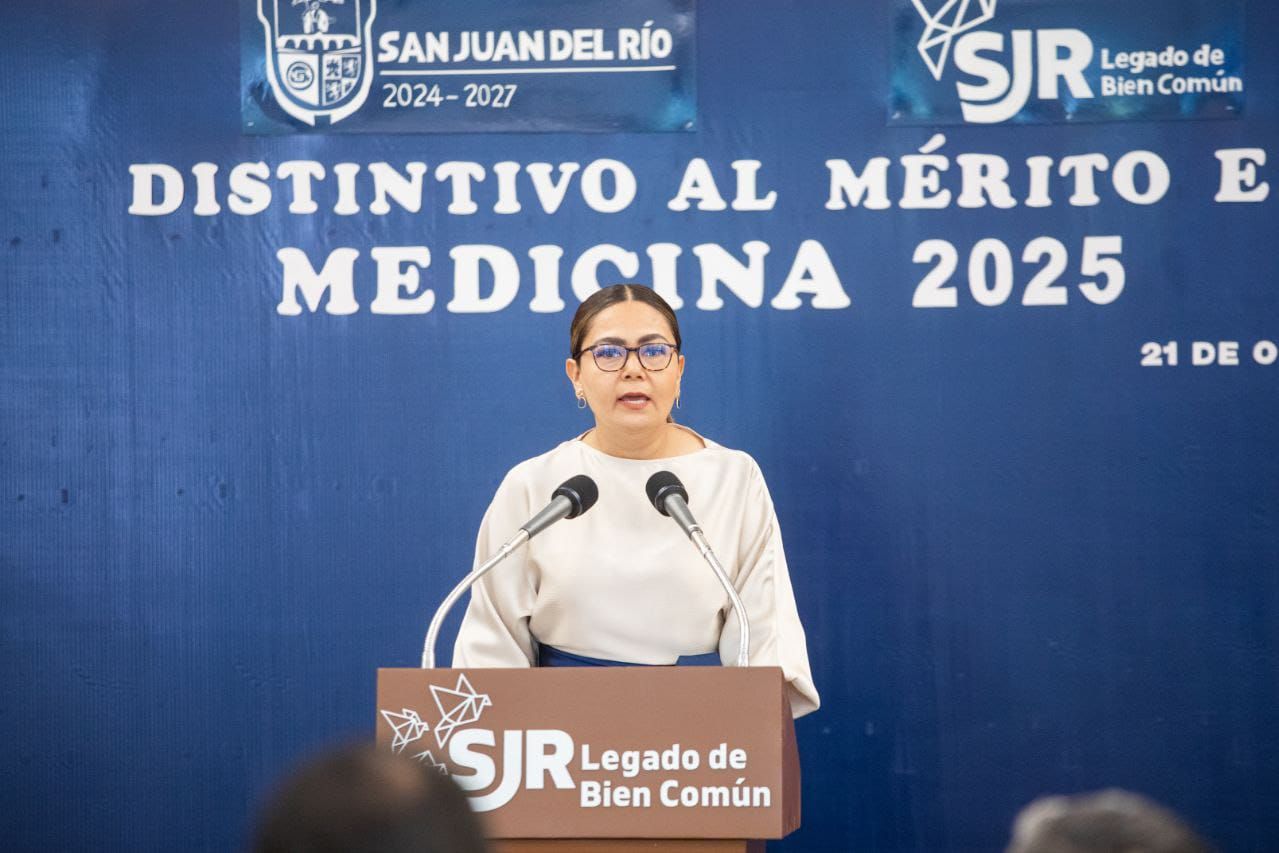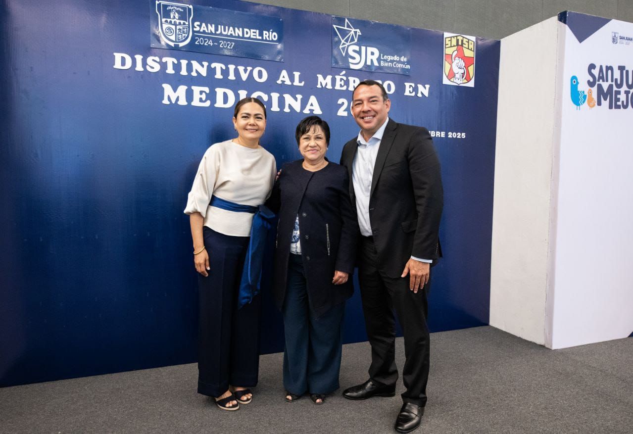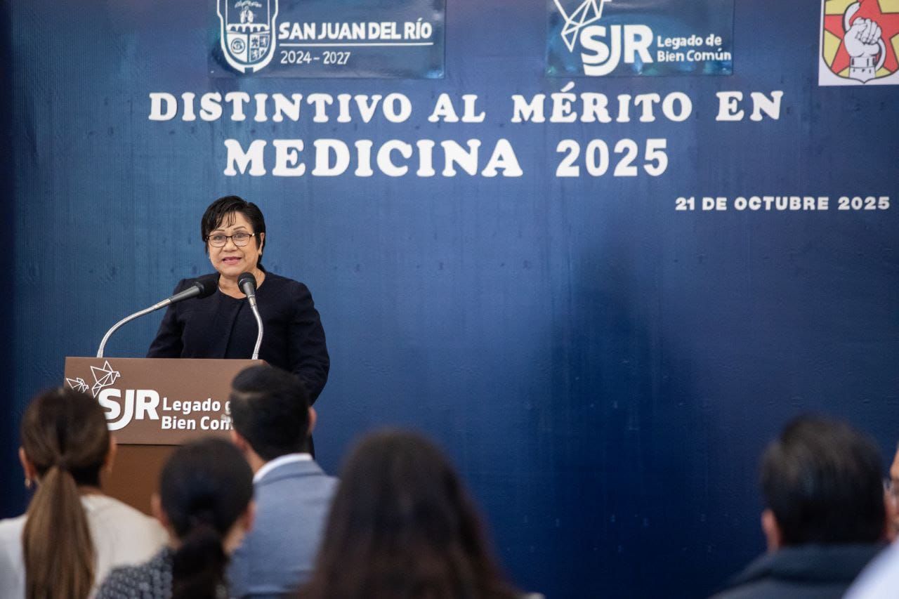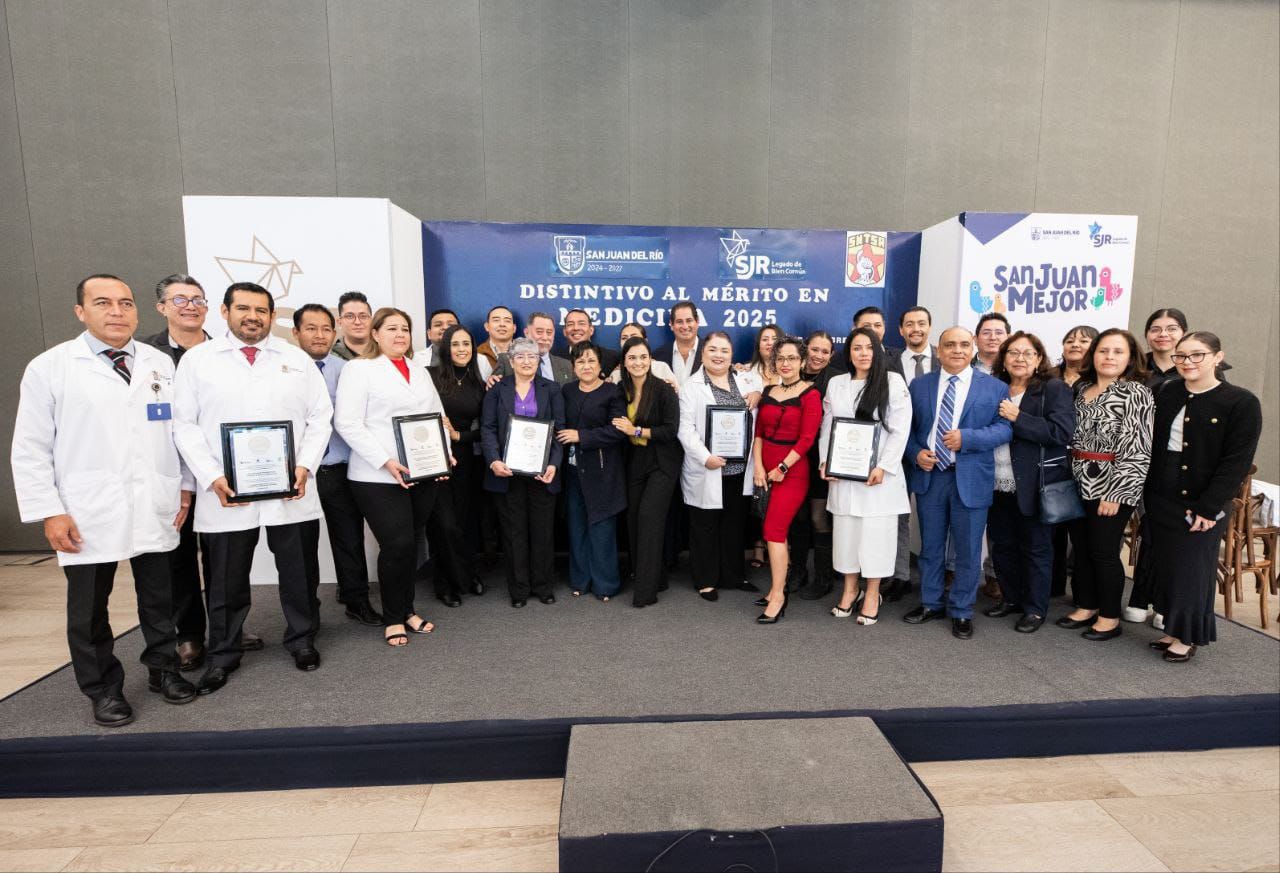 “El reconocimiento, el ‘Distintivo al Mérito en Medicina 2025’ tiene un valor muy especial porque surge de su comunidad, de su propio entorno laboral y porque pone en alto el esfuerzo de quienes dejan huella con su trabajo, su dedicación y su calidad humana. Estoy segura que para todos los directores fue difícil escoger a alguien, seguramente quisieran que el reconocimiento fuera para todas y todos, pero hoy, en representación de ese gran grupo de médicos que hay en San Juan del Río, lo reciben los galardonados”, puntualizó María Martina Pérez.