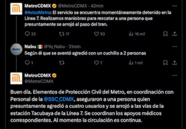 A través de las redes sociales, la red de transporte público dio a conocer que el servicio estaba momentáneamente detenido para lograr el rescate de la persona; sin embargo, no se dio a conocer que se trataba del agresor.
